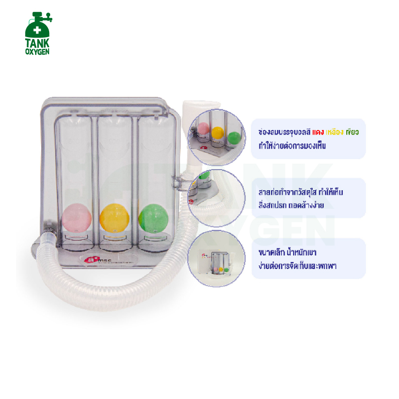 - ลดอาการแทรกซ้อนก่อนและหลังผ่าตัด จากรูปจะมองเห็นลูกบอล 3 ลูก อยู่ในแต่ละช่องและในแต่ละช่องมีขีดบอกปริมาตรมองเห็นชัดเจน มีสาย Mouthpiece ต่อเข้ากับเครื่อง สามารถถอดออกล้างทำความสะอาดได้ มีฟิวเตอร์สำหรับดักสิ่ง สกปรกที่ทางออกตรงฐานของเครื่อง